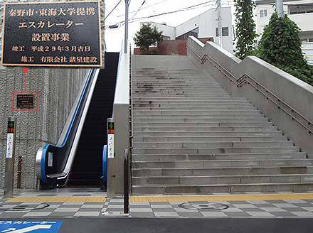 左側に見えてきたのは卒研のOB会で良く使っていたCooKさん。ここはまだ健在のようです。勾配がだんだんきつくなった先に見えてきたのは階段。ここは昔、心臓破りの階段と呼ばれていて、勾配のきつい坂を上った先に更にきつい階段があり心臓がバクバクいったところから名づけられたと言われているが、その横にエスカレータが見える。