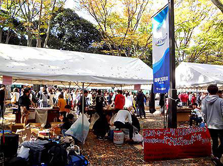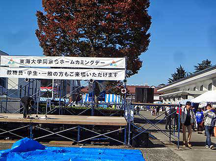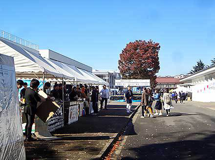お店の前にも屋台がいっぱい並んでいます。建学75周年の記念ののぼりもありました。