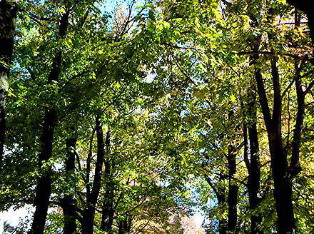 屋台テントの上には大きく育った欅が枝を伸ばし日差しを遮っています。