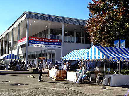 ここを通り過ぎると右側に見えてきたのが総合体育館です。その前にはホームカミングデイの方用のテントがありました。反対側には屋台が並んでいます。