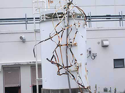 海岸に向けて坂道を下ると、途中の左右に汚染水を溜めたタンクが見えてきた。目の前には鉄骨で覆われた4号機が見える、地震で損傷し原子炉建屋を覆うように設置された鉄骨は東京タワーに使用された鉄骨と同じ4000tと言われている。4号機の使用済燃料は既に抜き取られている。