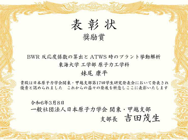 2024年3月8日に開催された日本原子力学会 関東・甲越支部主催「第17回学生研究発表会」において、4名の東海大学の学生さんが表彰され、奨励賞を地井桐理子さん、黒木裕也さん、妹尾康平さん、木賊尋也さんが受賞されました。おめでとうございます。