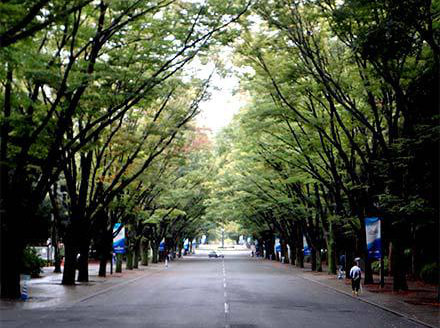 中央通りには両側から欅の木がかぶさり、薄暗くなっています。ここの欅は大学にお金が無くなったらこの欅を売ってお金に変えると聞いたものですが、売られる心配もなく大きく育っています。