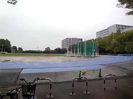 中央通りを進むと左側に見えてきたのは陸上競技場です。その先に見えているのは18号館(Science Plaza)とその手前に新しくできた19号館(通称:Techno Cube)です。工学部と情報理工学部は19号館に入っています。