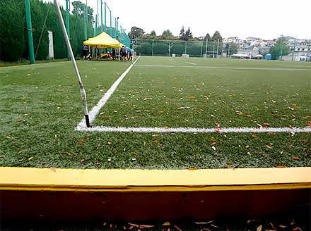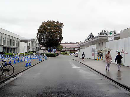 道路の右側には木立で遮られたラグビー場が見えます。東海大学のラグビーは今日も雨の中、練習の準備を行っていました。ラグビー場は今や人工芝が張られています。