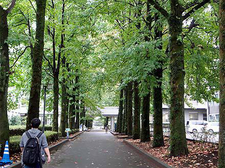 総合体育館への道の反対側は16号館、17号館に通じる道です。両側に欅の木が植わり、色着いた葉っぱが歩道の上に落ちています。
