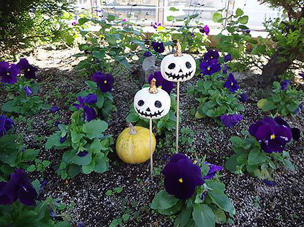 改札を出て歩道橋へ。歩道橋の植え込みにはハロウィーンの飾り付けが残っていた。