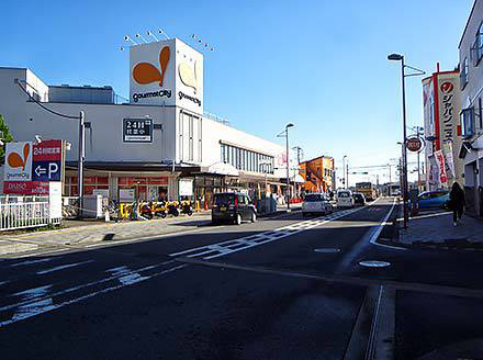 から大学に行ってみよう。大学近道への通りを過ぎて県道に出る。手前には24時間営業のスーパー、グルメシティ―の建物が見える。