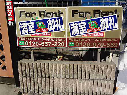 県道に出ると延々と続く坂道が見える。坂道の両側には商店や学生向けのアパート?マンションが並んでいる。結構満室で「満室御礼」の表示が見える。