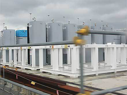 海岸に向けて坂道を下ると、途中の左右に汚染水を溜めたタンクが見えてきた。目の前には鉄骨で覆われた4号機が見える、地震で損傷し原子炉建屋を覆うように設置された鉄骨は東京タワーに使用された鉄骨と同じ4000tと言われている。4号機の使用済燃料は既に抜き取られている。