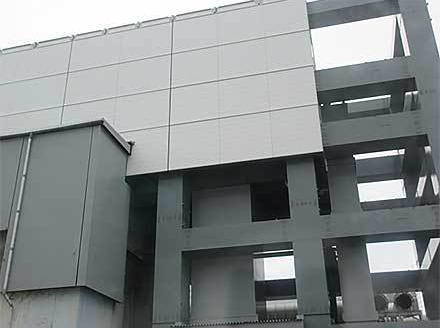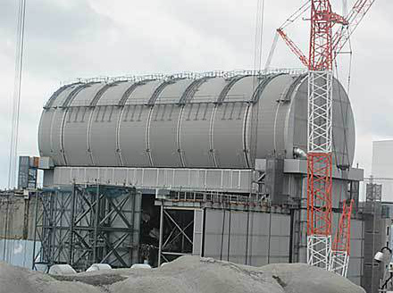 3号機原子炉建屋上部には使用済燃料プールから燃料を取り出すために設置された半円形のカバーが見える。11月から使用済燃料が取り出される予定である。