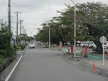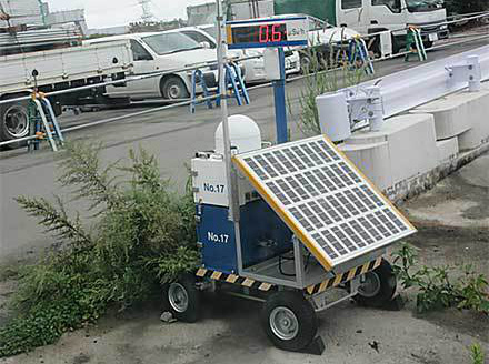 構内に設置されたモニタリングポストの表示は0.6μSv/hであり、途中に通った国道上より低い線量率を示している。
