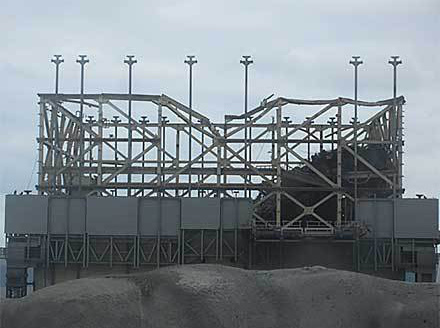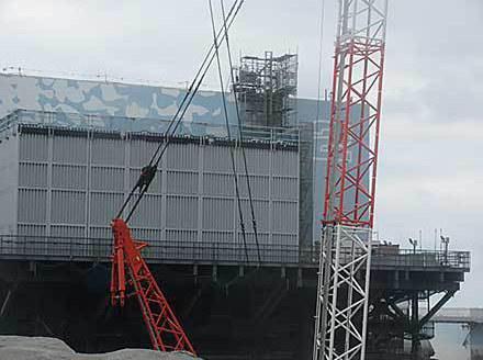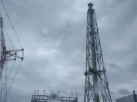1号機原子炉建屋が見える。上部の鉄骨がむき出しとなっている。よく見ると鉄骨の上に何か柱が飛び出ている。この柱は、がれき撤去作業中にダストが飛散しないように湿らせるスプレー装置とのことであった。