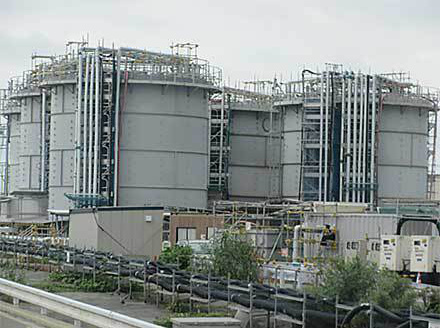 構内にはあちこちに汚染水を溜めたタンクがある。縦型タンクの途中にリングがあるのは「フランジ型タンク」と呼ばれるタンクでフランジの接合部から漏水があったため、現在は使用されず「溶接型タンク」に置き換わっている。