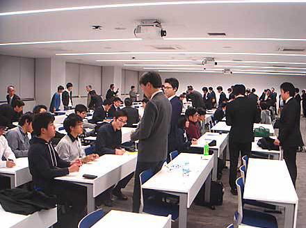 OBや企業の方及び学生を含め当初予定していた教室だけでは入りきれず2つの教室で懇親会を開始しました。懇親会参加の企業様及びOBからは一人千円の会費を徴収させていただき、また、企業様からのビール券のご寄付もあり豪華であるだけ飲み放題の懇親会となりました。