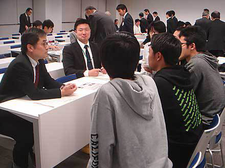 各企業のプレゼン終了後は個別の相談会が2回おこなわれました。学生にとっては12社から2社を選択しなければならず、選択が難しかったようです。この後の懇親会でも個別に相談する姿が見られました。