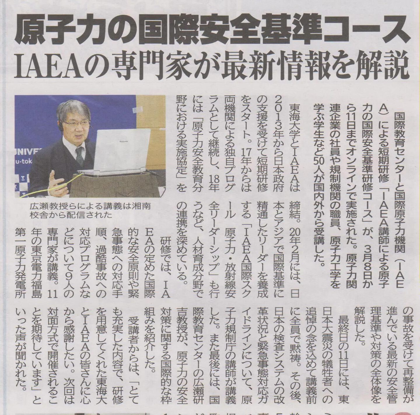 HOME | ニュース | ニュース2021 | 「IAEA講師による原子力国際安全基準研修コース」オンラインで開催(news2021-04-15) 「IAEA講師による原子力国際安全基準研修コース」がオンラインで開催されました。 東海大学国際教育センターと国際原子力機関(IAEA)による短期研修「IAEA講師による原子力国際安全基準研修コース」がオンラインで開催されました。 下記の東海大学新聞の切り抜きをご覧ください。 出典元(東海大学新聞 2021年 4月 1日版)