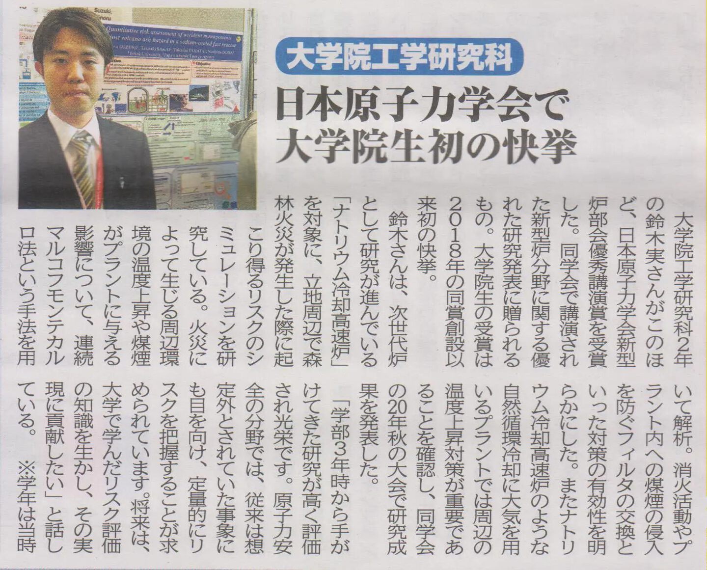 HOME | ニュース | ニュース2021 | 東海大学大学院生鈴木実さん「新型炉部会優秀講演賞」を受賞 東海大学大学院生の鈴木実さんが日本原子力学会新型炉部会優秀講演賞を受賞しました。 日本原子力学会秋の大会(2020年)で東海大学大学院生の鈴木実さんが日本原子力学会新型炉部会優秀講演賞を受賞しました。大学院生の受賞は同賞創立以来初の快挙です。 おめでとうございました。 出典元(東海大学新聞 2021年 4月 1日版)