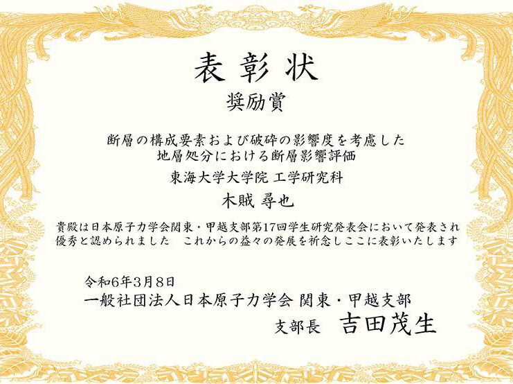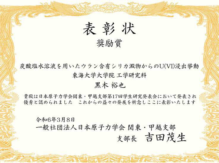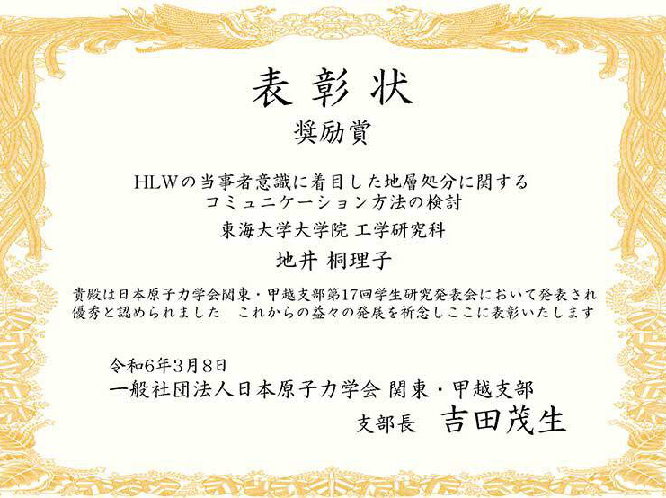 2024年3月8日に開催された日本原子力学会 関東・甲越支部主催「第17回学生研究発表会」において、4名の東海大学の学生さんが表彰され、奨励賞を地井桐理子さん、黒木裕也さん、妹尾康平さん、木賊尋也さんが受賞されました。おめでとうございます。
